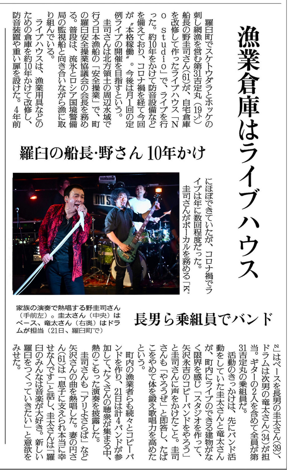 漁業の他に音楽スタジオを運営して地域活性化の為に月例イベントをやっています。
