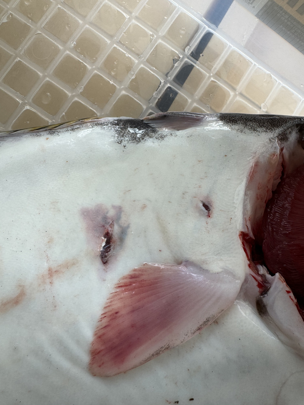 船に揚げる時に海に落としてしまいハヤスケ(落としと魚を回収する漁具)で傷がついてしまった為、大特価で御提供致します!!