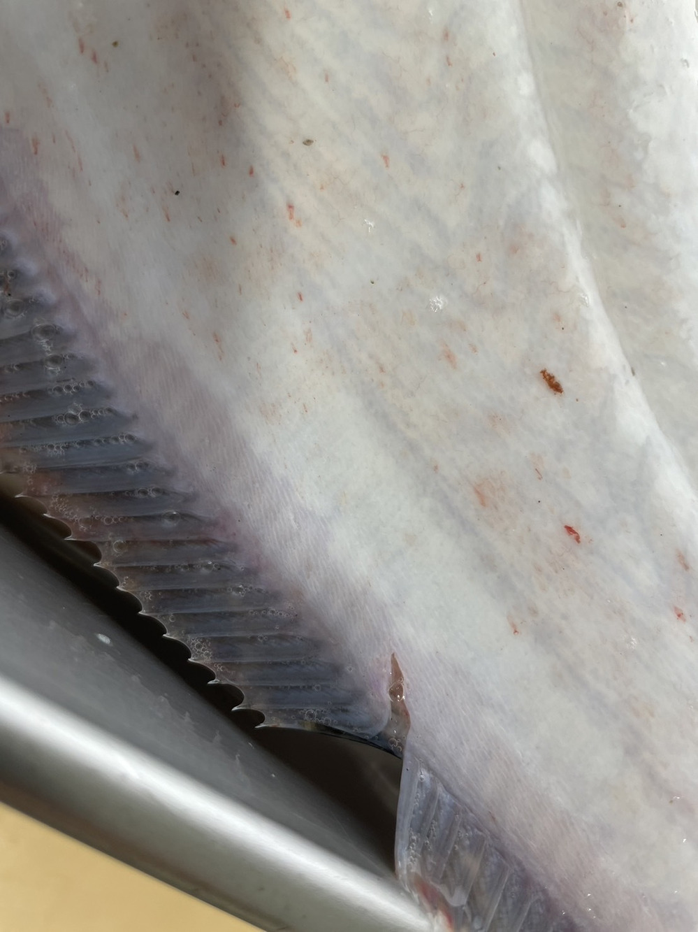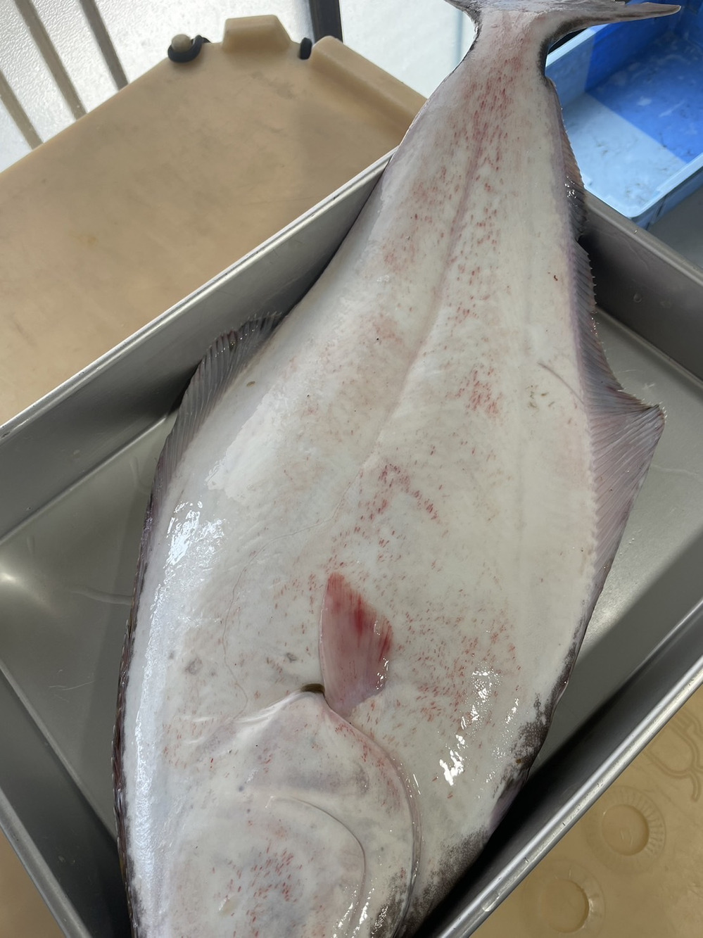3.5kgのオヒョウは打ち身で少し赤くなり、傷があるので大特価です。