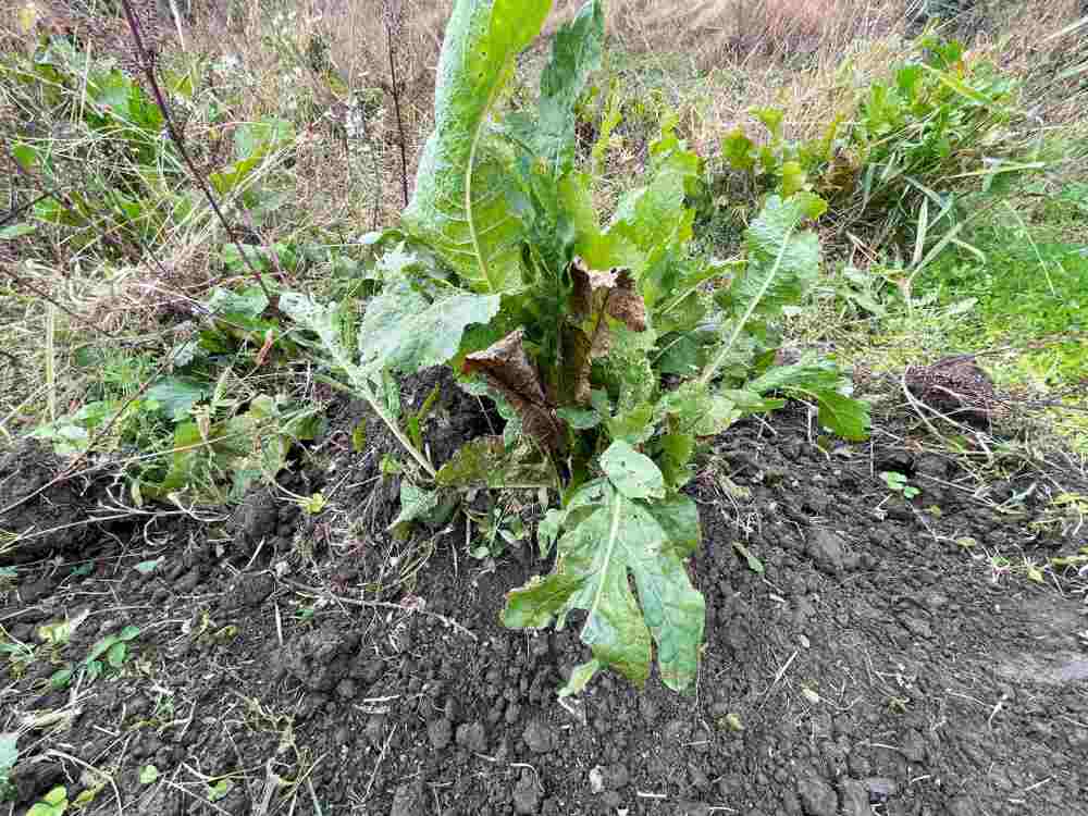 状態としては、まだ葉っぱが枯れておらず、青々としています。12月になると葉っぱが枯れ、根に栄養成分が溜め込まれるため、太くなります。ホースラディッシュは太いほどより一層辛味が増します。収穫・発送まであと1ヶ月ほどお待ちください。