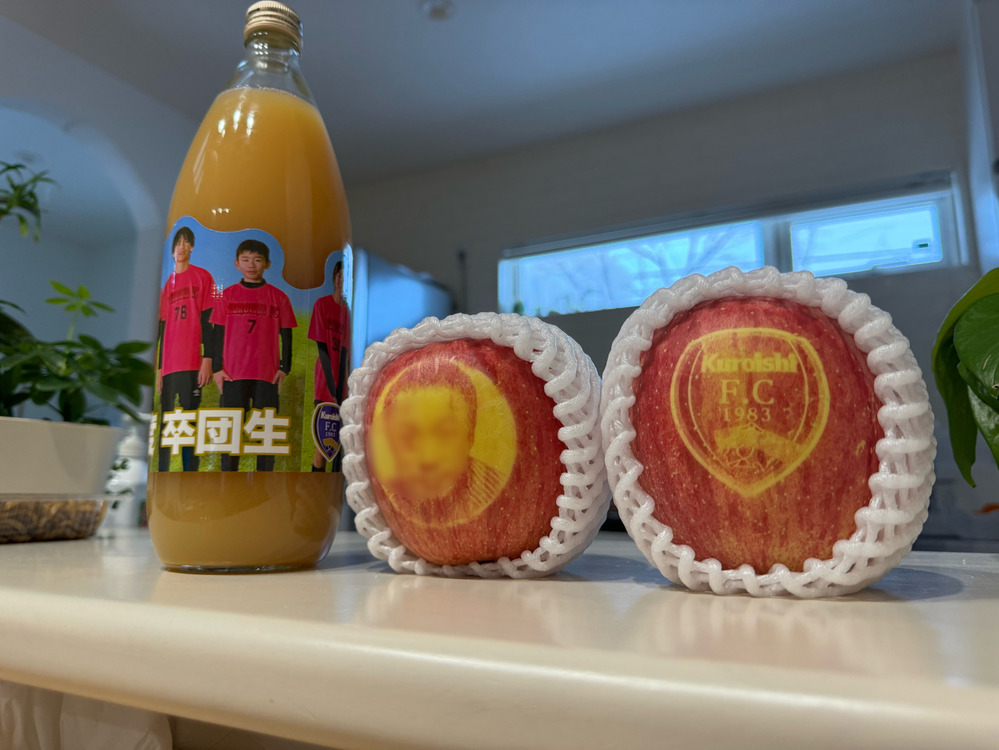 代表とチームマーク入りのりんご、卒団生9人の、オール正面りんごジュース。