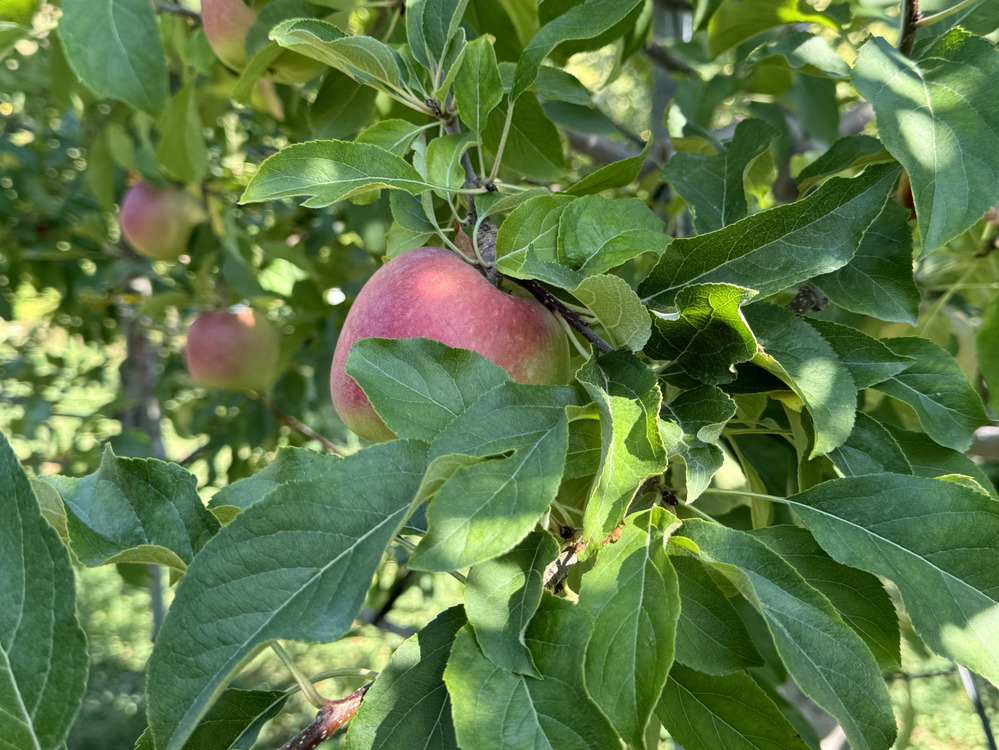 干ばつで猛暑の中、葉っぱに守られながら、うっすらと赤みを帯びてきました。あと10日前後で収穫見込みです。