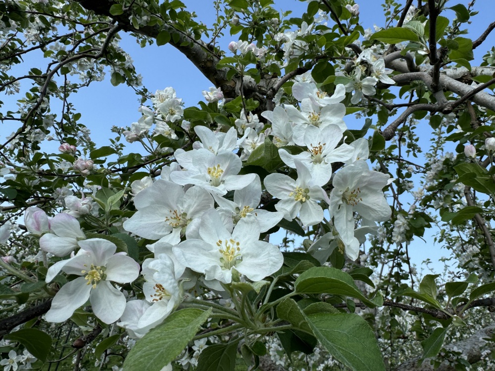 豪雪に耐えて、凛と咲き誇るりんごの花たち。