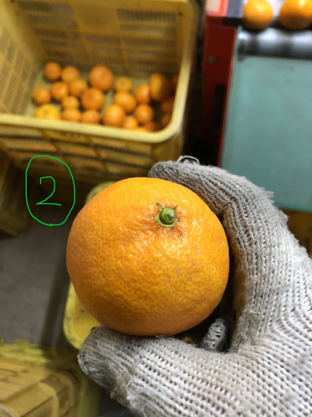 選果中の写真で見にくいのですが、①が家庭用で送っている物になります。表面の皮に模様が入っていますが、中身と味は贈答用の物と同じく全く問題ありません。
