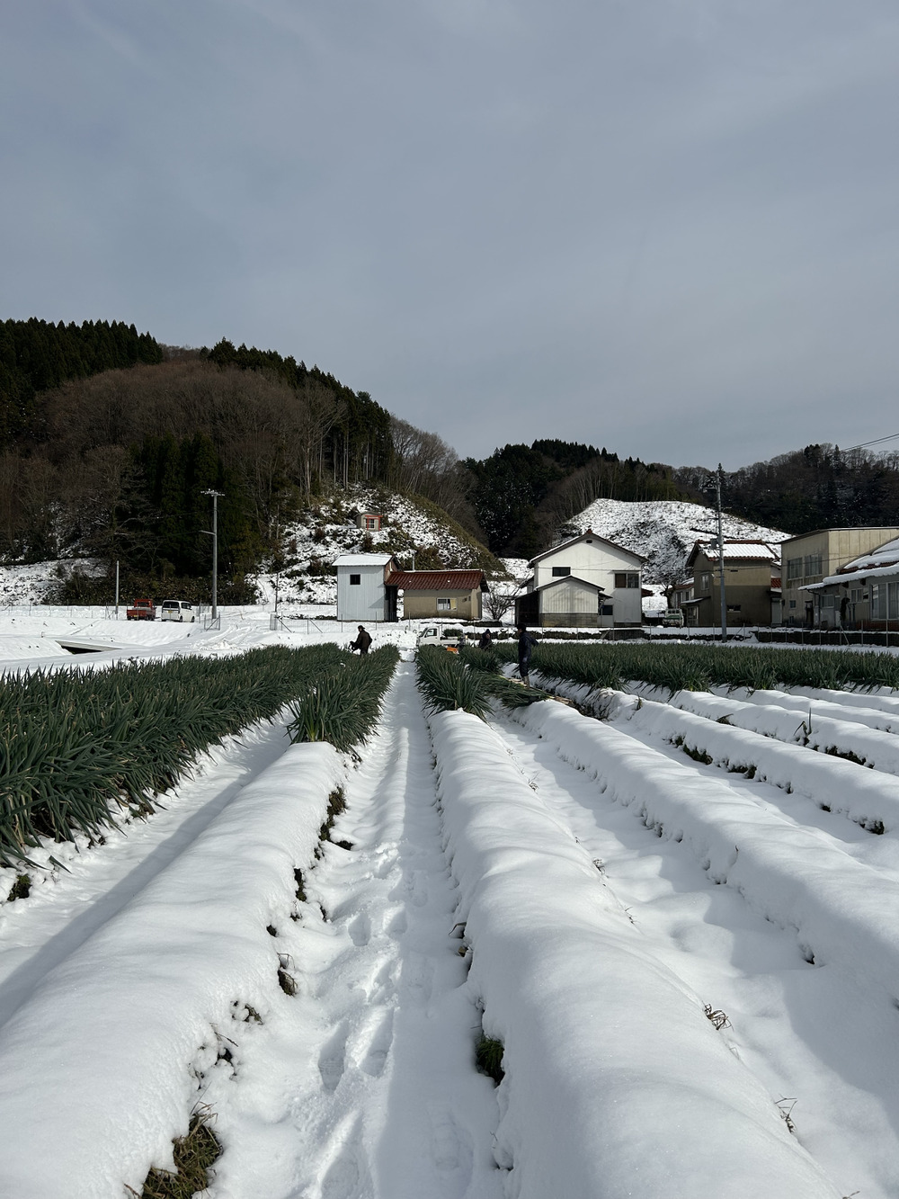 三瓶はようやくうっすらと雪が積もり、雪かぶりネギとなりました。収穫作業はとても寒いので、たくさん着込んで見た目はまるで雪だるま☃️(笑)