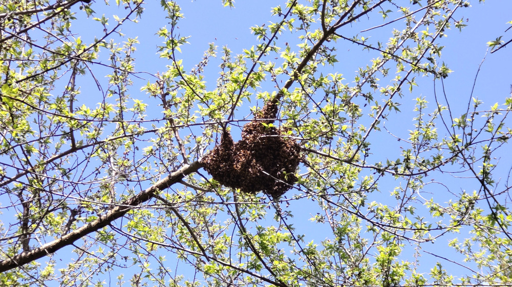 偶然、当園の小梅の木に巣分かれした日本ミツバチが塊になってました。自然界で見つけるのは難しいそうなのでよければご覧ください。