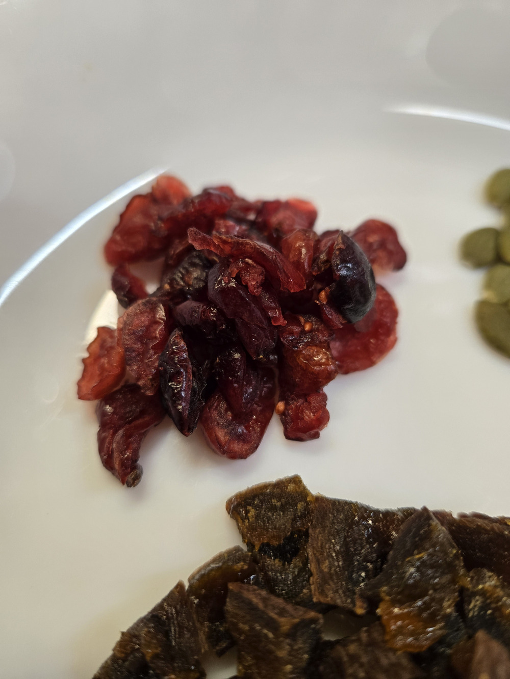 私の場合は成分無調整の豆乳を使います。ラズベリーと干しブドウは別途加えました。干しブドウは有機栽培品ですがかなり甘いので少量でおさえます。ラズベリーは好物なので少々大目。アーモンドは製品に入っていたままの量でいい感じです。かぼちゃの種は追加で別途加えました。