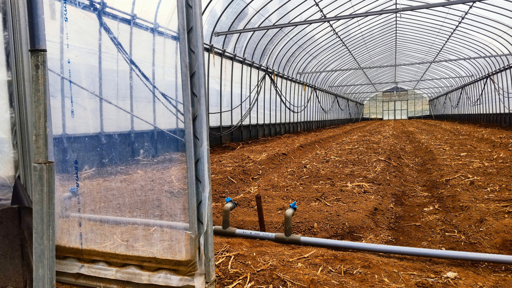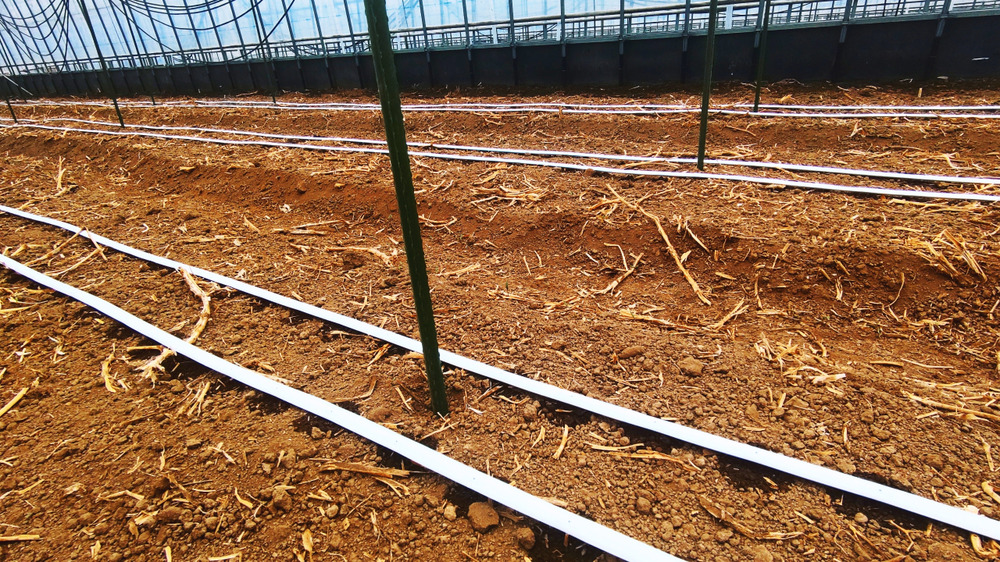 ワイヤーから吊るす誘引方法であるため、ワイヤーを支える支柱を挿していきます!