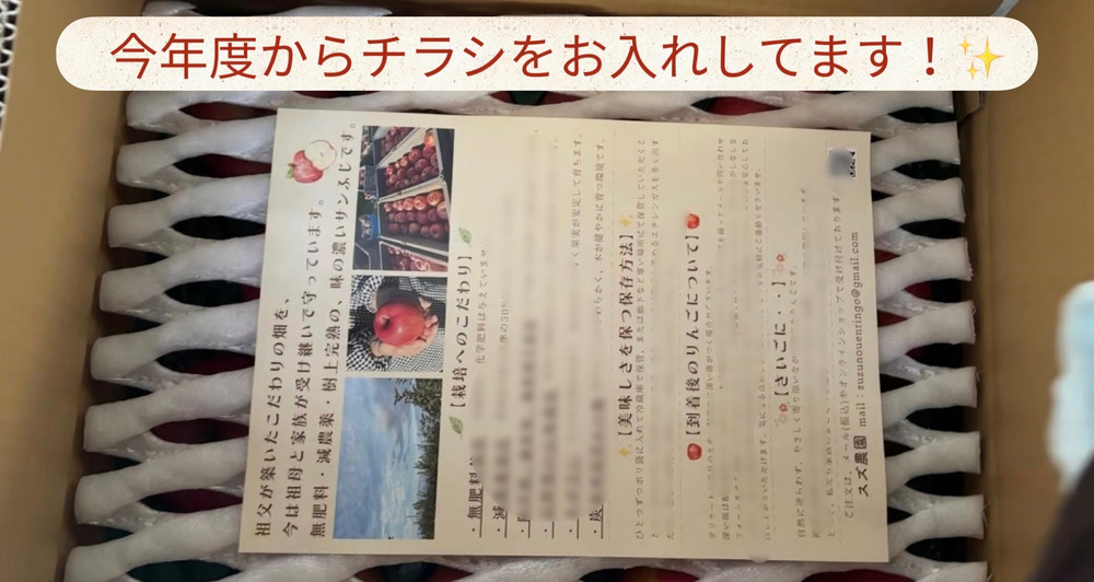 万が一、傷が深いりんごがある場合、集荷時や輸送中に発生した事故の可能性が高いため、お手数おかけしまして大変申し訳ございませんが、問い合わせフォームまたはメールより、ご連絡いただけますと幸いです🙇♀