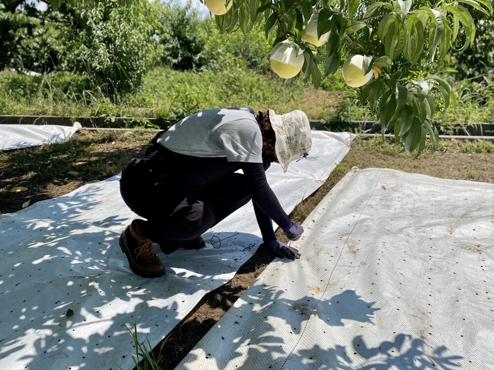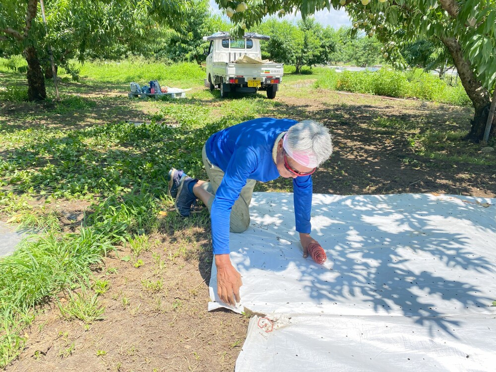 おひさまの光をたくさん反射させて桃の実に当たるようにします。