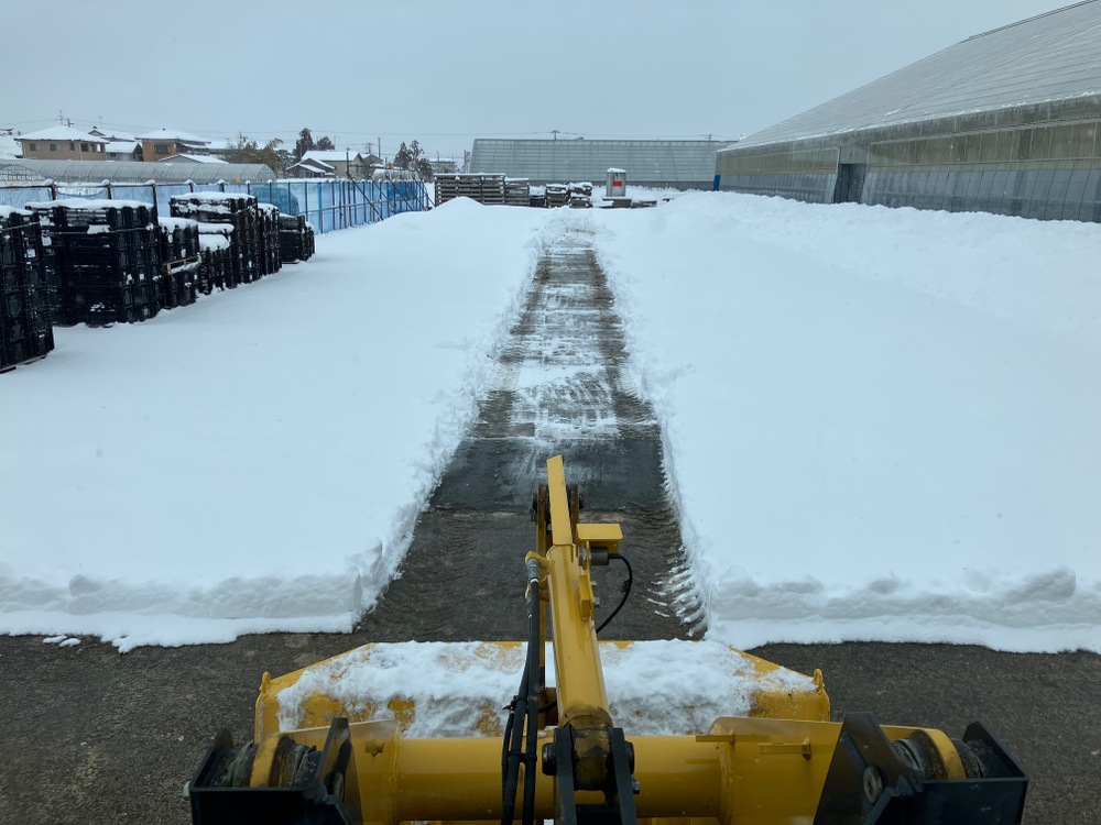 ご覧のようにハウスの脇に積もった雪がビニールハウスの肩を過ぎたら屋根から雪が落ちなくなり、雪の重みでハウスが潰れることになるのですが、今のところは片岡ファームのハウスは大丈夫です。