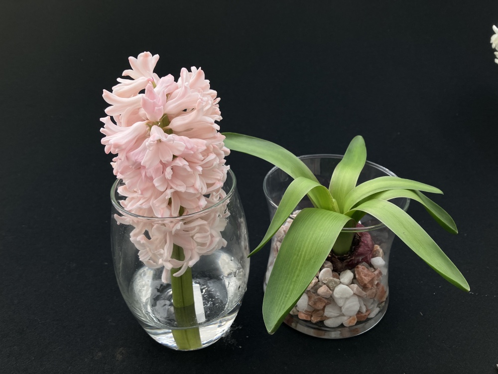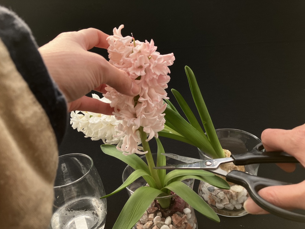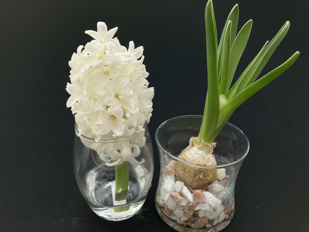 ヒヤシンスの花はボリュームがあるため、水耕栽培で育てていると 時に容器ごと倒れてしまったり、茎が曲がってしまうことがあります。