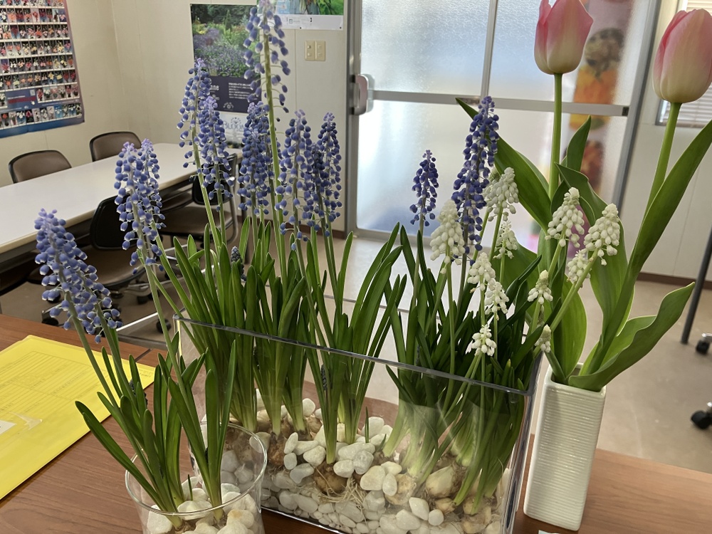 そんな春の気配の中、私たちのハウスでは水耕栽培のヒヤシンスやムスカリ以外でも、一足早くチューリップの花も咲き始めています。