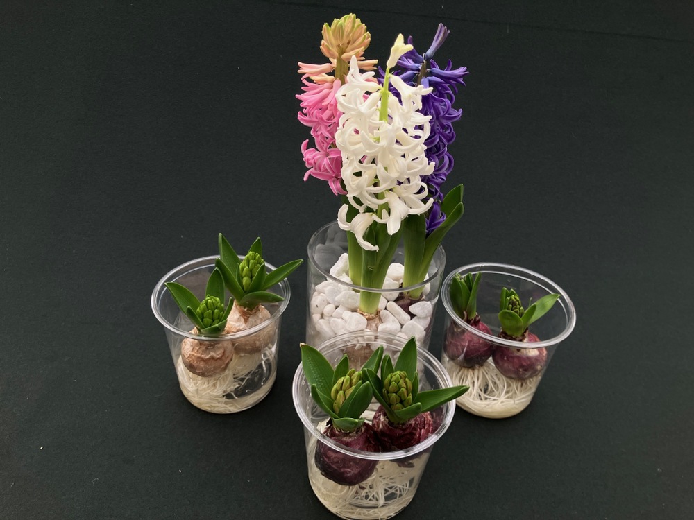 2週間前に花芽付き球根の花芽がまだ小さい時にヒヤシンスをベースに入れて事務所に飾っていた時はとっても小さく、少し心配していました。