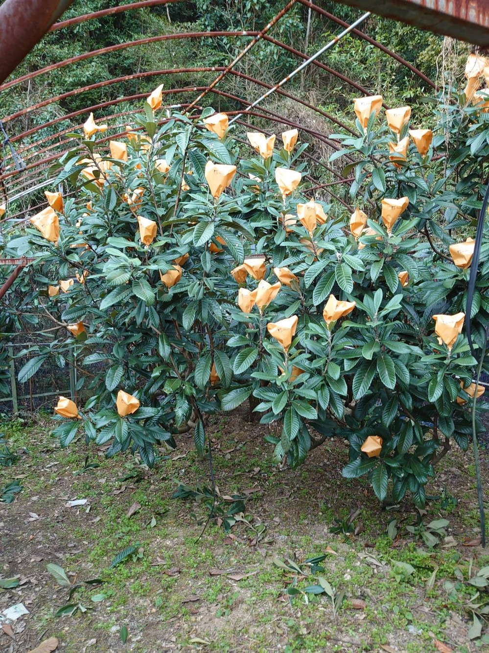 びわの木と言ったら "上にデカか" イメージがあると思いますが、今は上に伸びた枝を地面の方にワイヤー引っ張って木を低くしています。