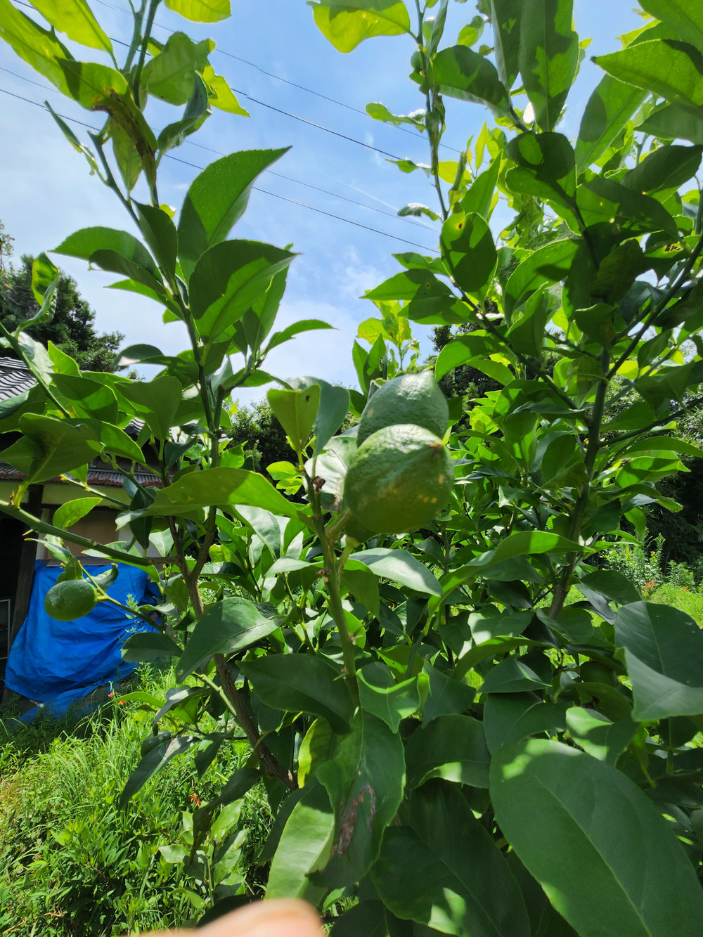 昨日出荷させていただいたレモン🍋が、お客様の元に到着し始めました。無事に着いたことは、流通の神様皆様に感謝申し上げます。温かい御目で御覧いただいたお客様には、深く深く感謝申し上げます。励みになりました。 昨日、今日と朝5時20分、明るくなるのを待って摘果、寝ぼけて1つは、地面に落としてしまったのが、写真です。もう1つは、見たこともなかったですが、花が咲いたように、お尻が自然にさけて木になっていました。