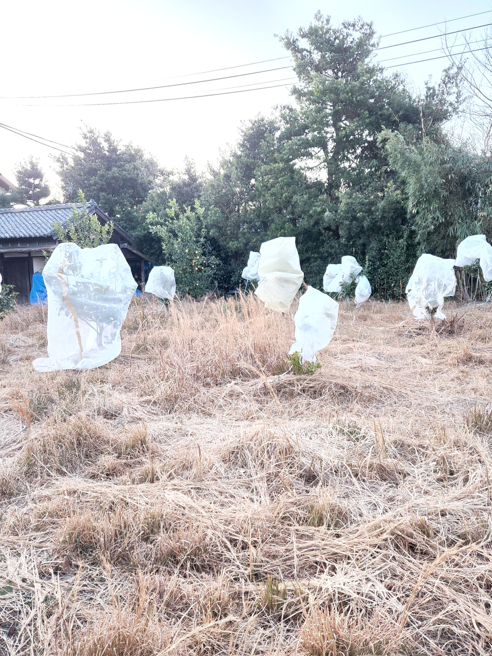 寒冷紗(防寒袋)をかける日々。昨日午後5時40分頃、風花まで。1分でやみました。