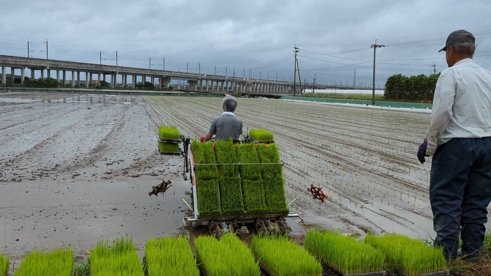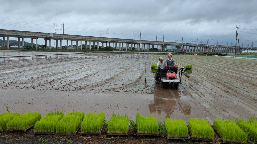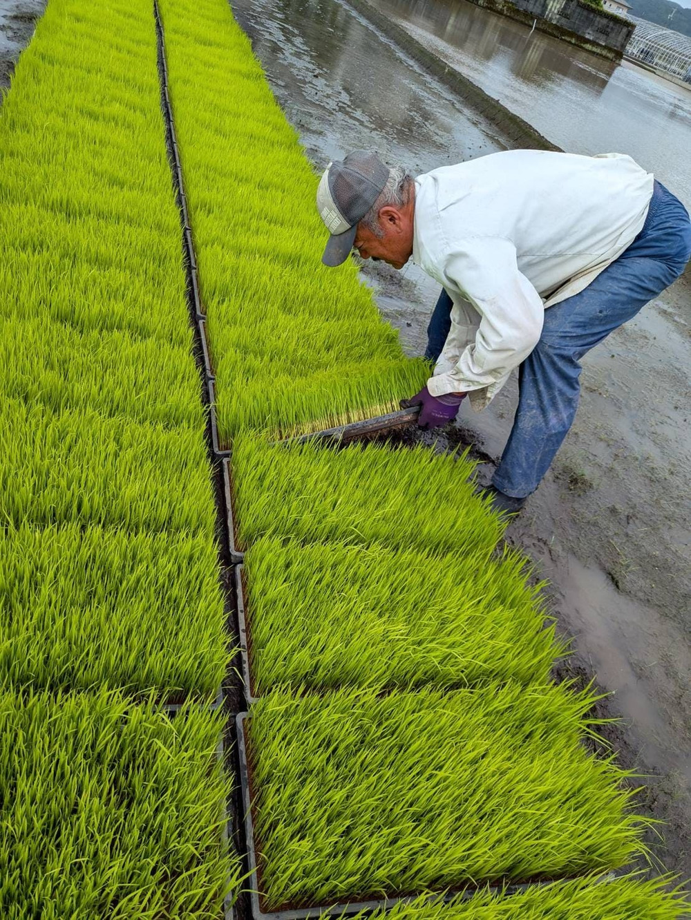 6月20日頃から5日間ほどかけて、今年の稲の田植えを行いました。苗をトラックで運んで田植え機で植えていきます。機械が入らない四隅は手で植えていきますよー!