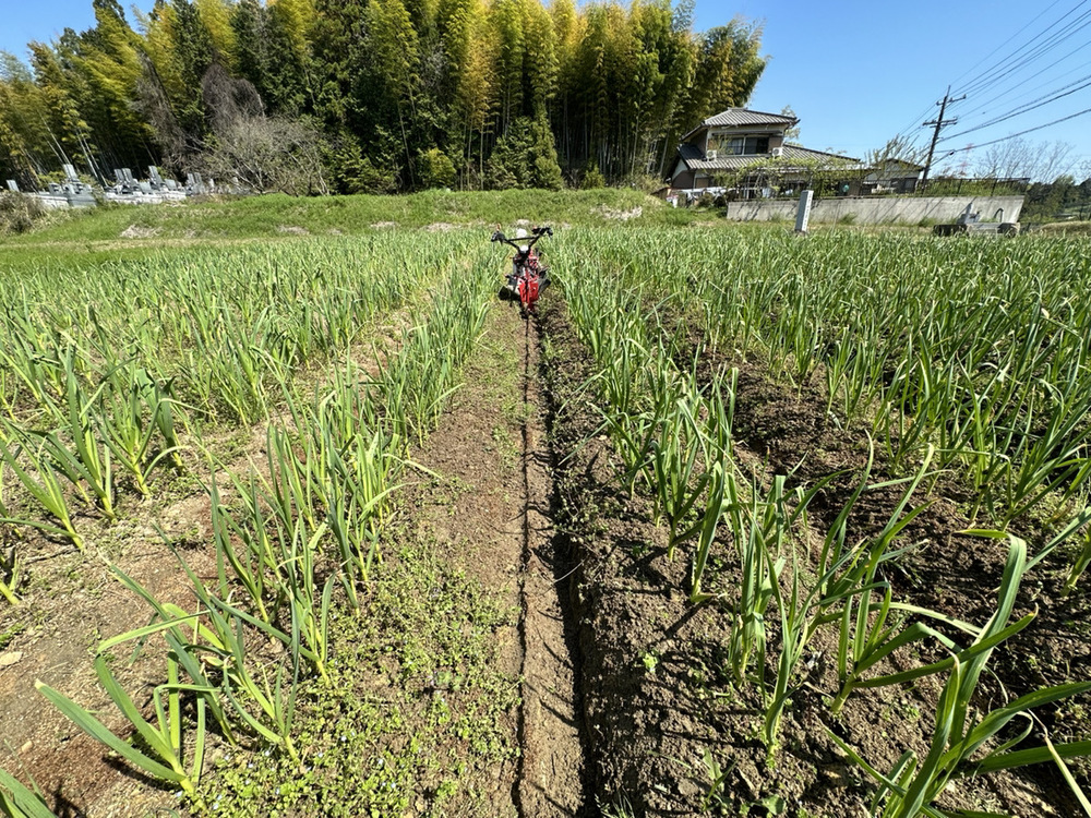 4月中旬にも、自家製の籾殻ぼかしを畝間に撒いて、