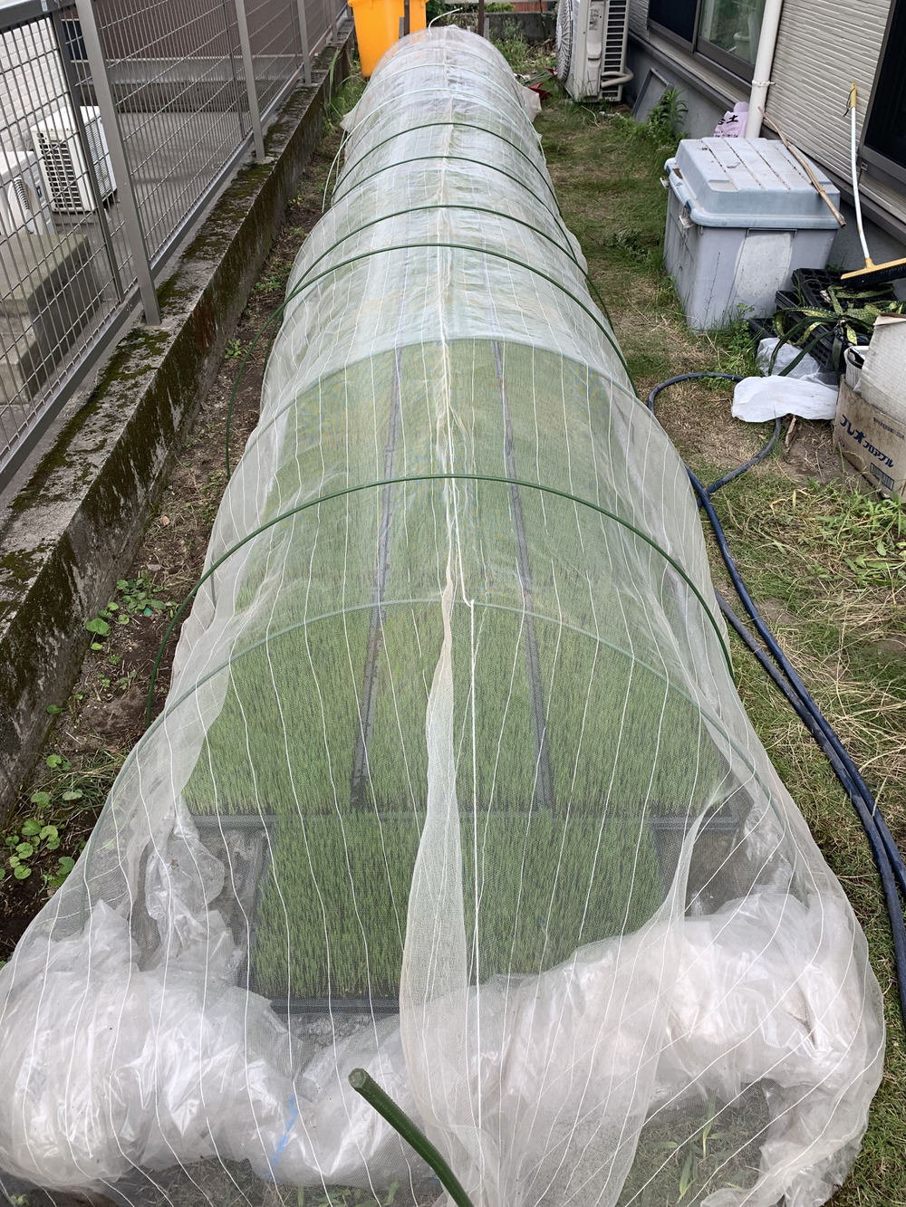 米、ハッピーヒルとヒノヒカリをブルーシートをはがし葉を大きくさせる為に防虫ネットのみ!!