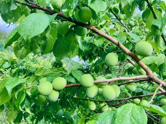 ご覧のように梅畑が草だらけなのは、農薬や除草剤を使わず、なるべく草を刈らずに根も残し、圃場内の生態系を豊かにすることを狙ってのことで、草生栽培とも呼ばれています。夏場の土壌の乾燥を防ぎ、水分の枯渇により梅の実に起こる陥没症の防止にもなるとも考えています。梅の実の皮まで安心して食べられるよう、このような栽培を続けています。