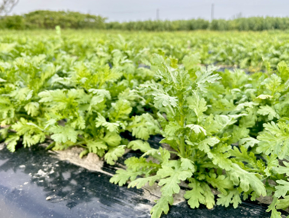 青々とした緑一面の春菊畑に、ぽつんと一輪、黄色い花が咲いていました。