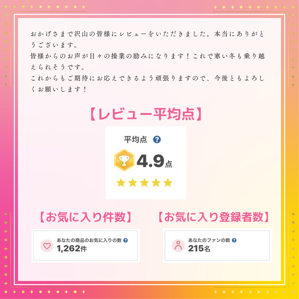 おかげさまで沢山の皆様にレビューをいただきました。本当にありがとうございます。