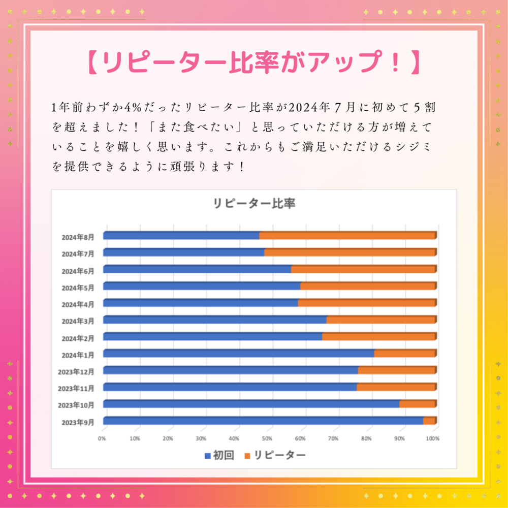 300件を機にリピーター比率を算出したところ、 1年前わずか4%だったリピーター比率が、2024年7月に初めてリピーター比率が5割を超えました。