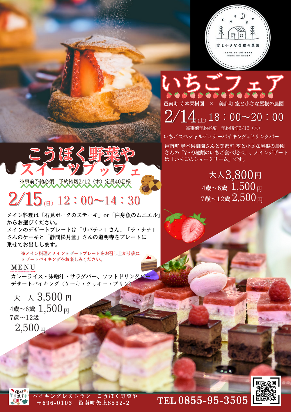 2/14に、「バイキングレストラン こうぼく野菜や」でイチゴフェア開催🍓