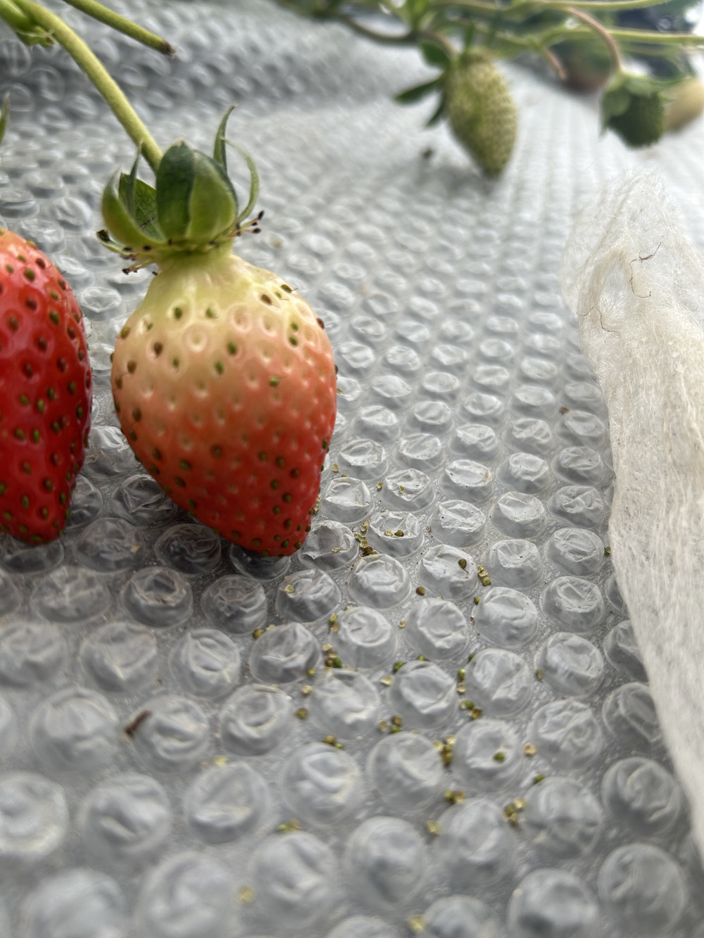 野ネズミ被害あいました〜💦野ネズミはこの時期外に餌がない且つ寒いので、餌があり且つ暖かいハウスに来ます。そしてイチゴの「種」を食べます。3枚目写真が被害果です。よく見ると下に食べかすが落ちてます。