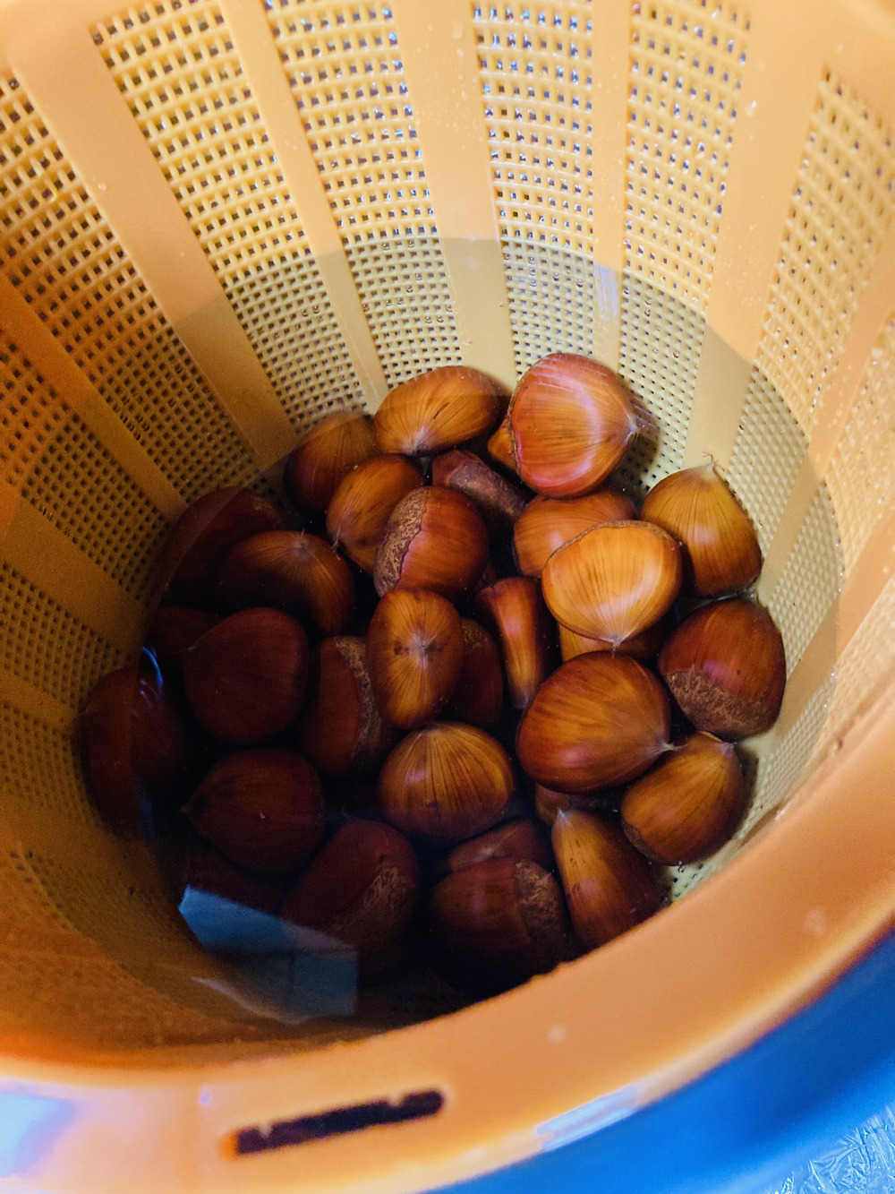 次にいれものに水を張り栗をいれていきます。
