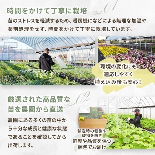 いつも「みんなの花屋さん ほのか」をご利用いただき、誠にありがとうございます。2023年7月の出店以来、多くのお客様に宿根草・花木類をご購入いただき、心より感謝申し上げます。 この度、食べチョクの出品基準に基づき、「お届け時点でそのまま飾って楽しめる完成品」でない商品は出品対象外となる旨のご案内を受けました。宿根草や花木類の多くは、お客様ご自身で植え替えて育てていただく「苗」としての販売形態に該当するため、誠に残念ではございますが、当該商品の販売を終了させていただくこととなりました。なお、開花株につきましては基準を満たしているため、品種は限られますが今後も販売を継続いたします。 引き続き、皆さまに喜んでいただける植物をお届けできるよう努めてまいります。今後とも「みんなの花屋さん ほのか」をどうぞよろしくお願い申し上げます。