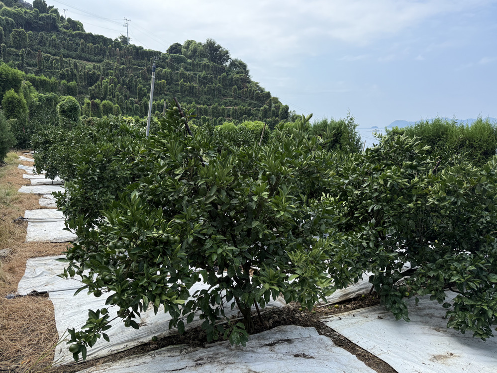梅雨明けより、マルチシートを畑中に被覆し、点滴冠水で水分を調整しながらストレスをかけ、最高のみかんになるよう、毎日摘果(間引き)をしております。