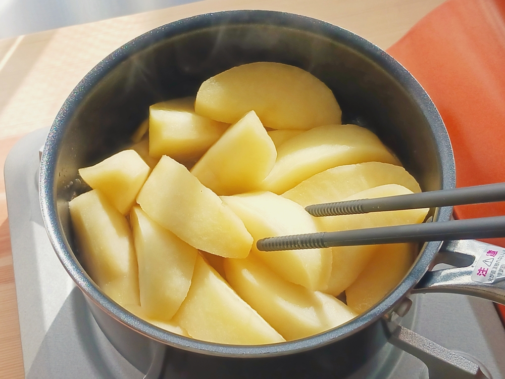 ⑥りんごが透き通っていることを確認したら火から下ろし、ふたをしたまま冷まします。人肌くらいまで冷めたら煮りんごの完成です。