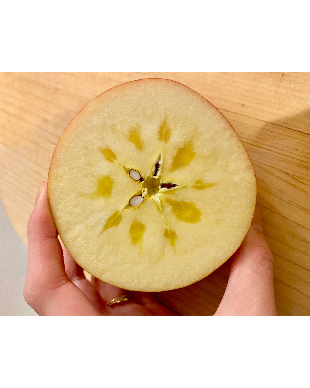 とれたてのりんごには「蜜」と呼ばれる甘さとおいしさが凝縮された部分が中心部に存在します。時間が経つとともにりんご全体に分散して失われてしまうので、ぜひお早めにお召し上がりください。