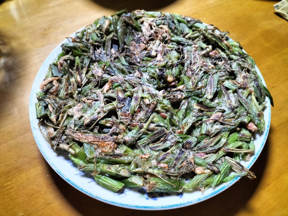 極太、超長のセリで、チヂミを作りました。熱々のご飯の上にのせて、オイスターソースをチョロっと掛けて頂きました。