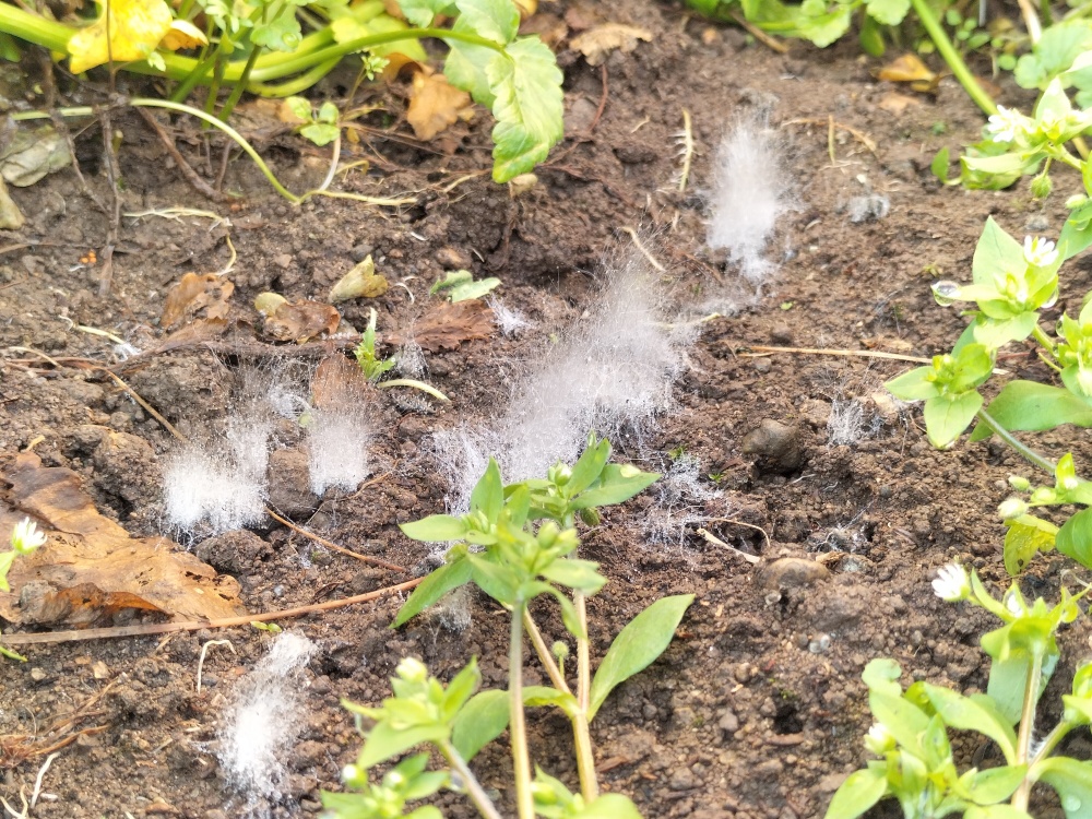 セリの畑の土の上に不思議な白い綿毛がたくさんありました。小さくて何とも愛らしい形でした。昔流行ったこびとビートの妖精みたいな感じでした。調べてみた所、地蜘蛛の巣に似ている気がしましたが、正確には同定できませんでした。とても面白い自然の為せる術、引き続き注意して観察していきたいですね。