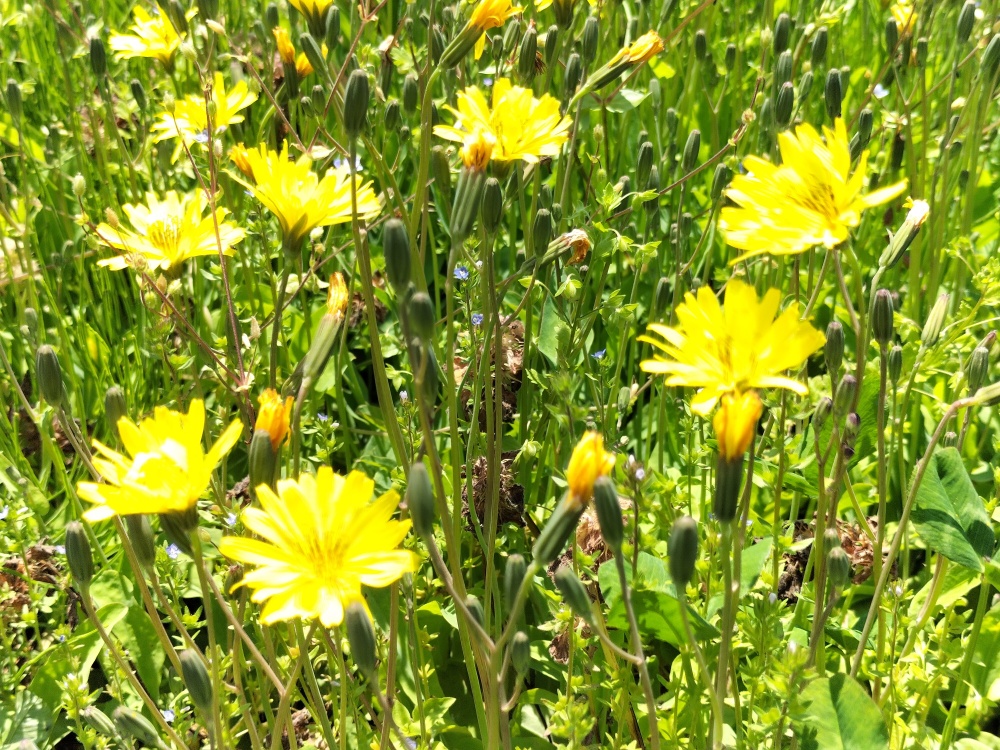畔に咲いていた黄色く小さい花はジシバリです。タンポポの仲間の野草です。