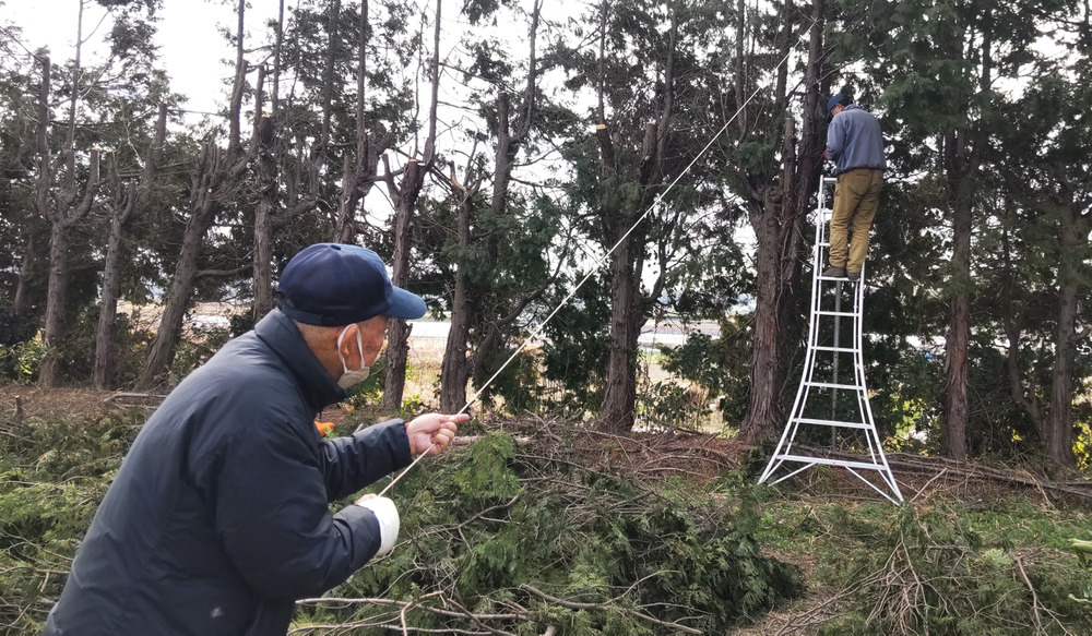 防風林の高さが高過ぎるので、ロープで倒す方向に引っ張り、