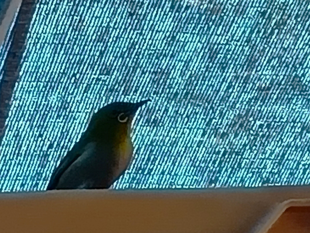 少し目の周りが白いのが特徴で、毎日頑張っています。写真をアップしました。その正体は…そう、メジロです!今日は作業小屋に迷い込んで、天井付近を行ったり来たりしていました。 下の方に出口があるのに行ってくれません、仕方なくシートを剥がして上の方に隙間を作り、やっと外に逃げました。「また明日から元気に活躍してくれることを期待しています!」
