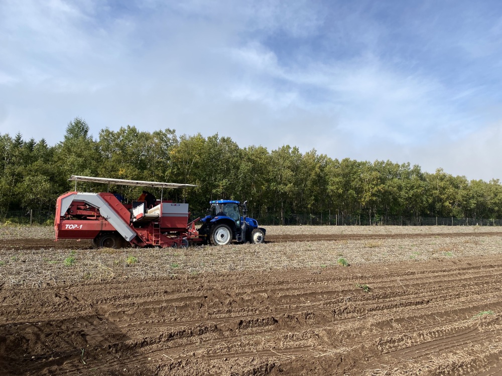 北海道の広い畑をトラクター牽引のポテトハーベスターという機械で、収穫&選別していきます。
