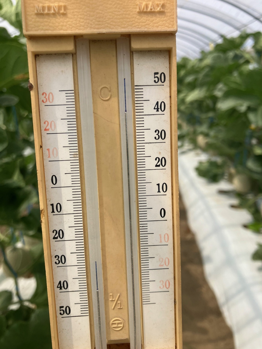 理由は風です。午前中は風が弱い為ハウス内の温度も🌞上昇しがちです。一方昼を過ぎると少しずつ風が吹いてくるのでハウス内の温度は外気温に近くなります。
