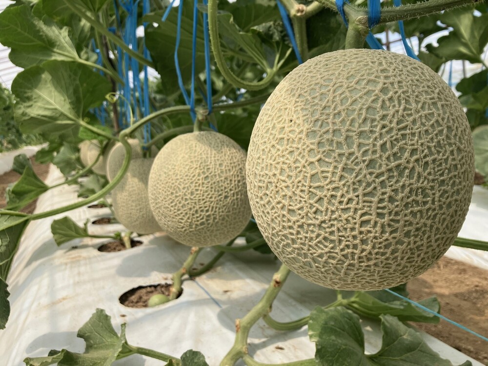 外気が35度の場合ビニールハウス内の温度は45度くらいになることもあります。暑すぎるとメロンは高温障害によって葉が萎れたりして収穫までもたないこともあります。今年は暑さ対策として遮光ネットを購入し、メロンが高温障害にならないように対応しています。遮光率は30%程度でこれを使うことで程よい日差しがメロンの葉にあたり、ビニールハウス内の温度上昇を抑えることができます。