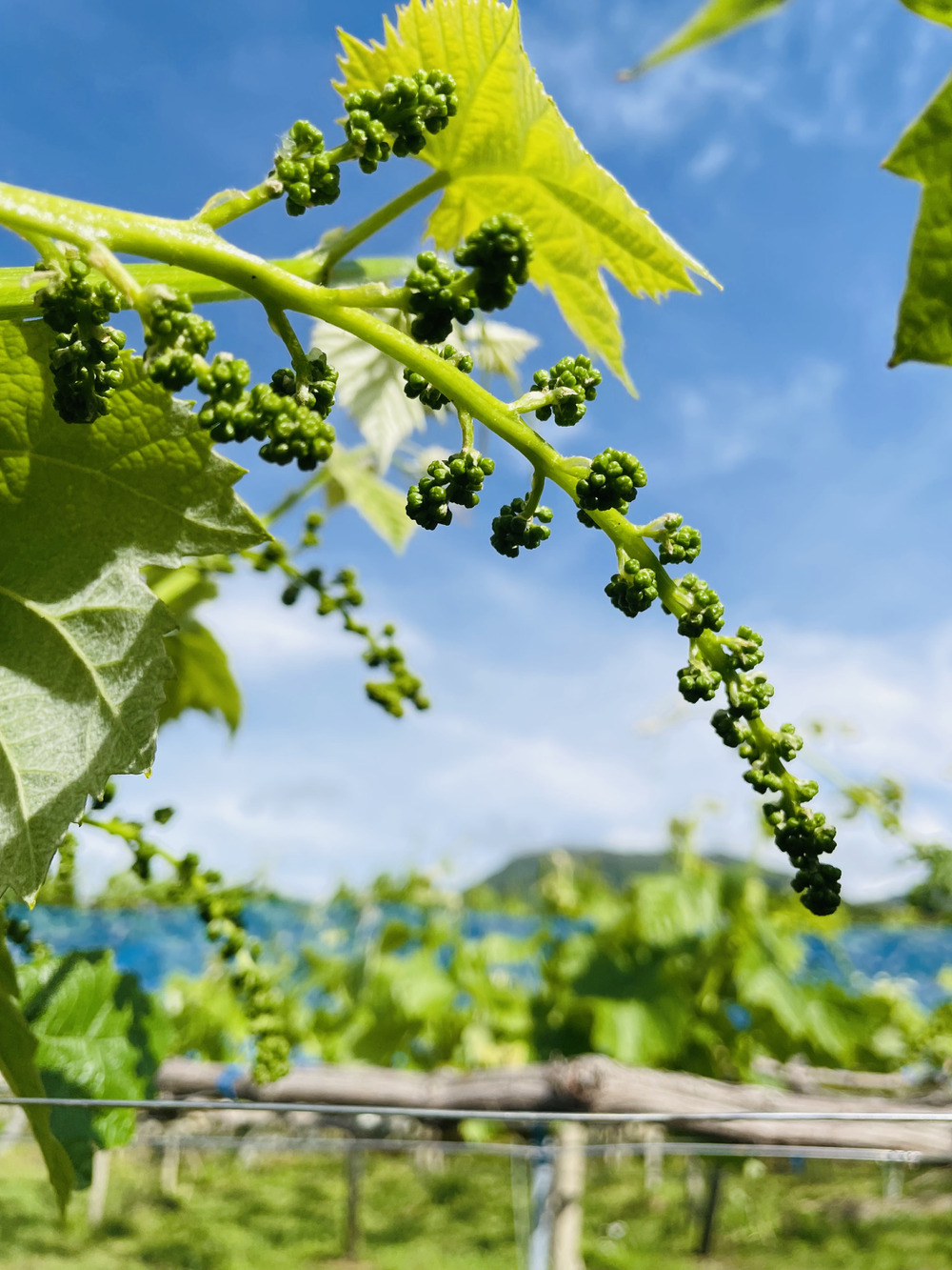 お手伝い隊さんたちも出動し、桃の摘果と同時進行で巨峰やシャインマスカットの誘引が始まっています。