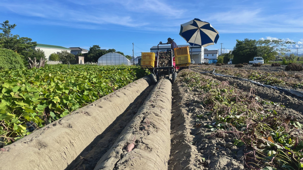 お盆明けから紅はるかの収穫をはじめました。収穫後すぐの紅はるかの食感は、実はなると金時と同じホクホク系です。2、3ヶ月間、13度前後で貯蔵するとねっとり食感に変化していきます。そのため、紅はるかの販売は10月下旬頃を予定しています。