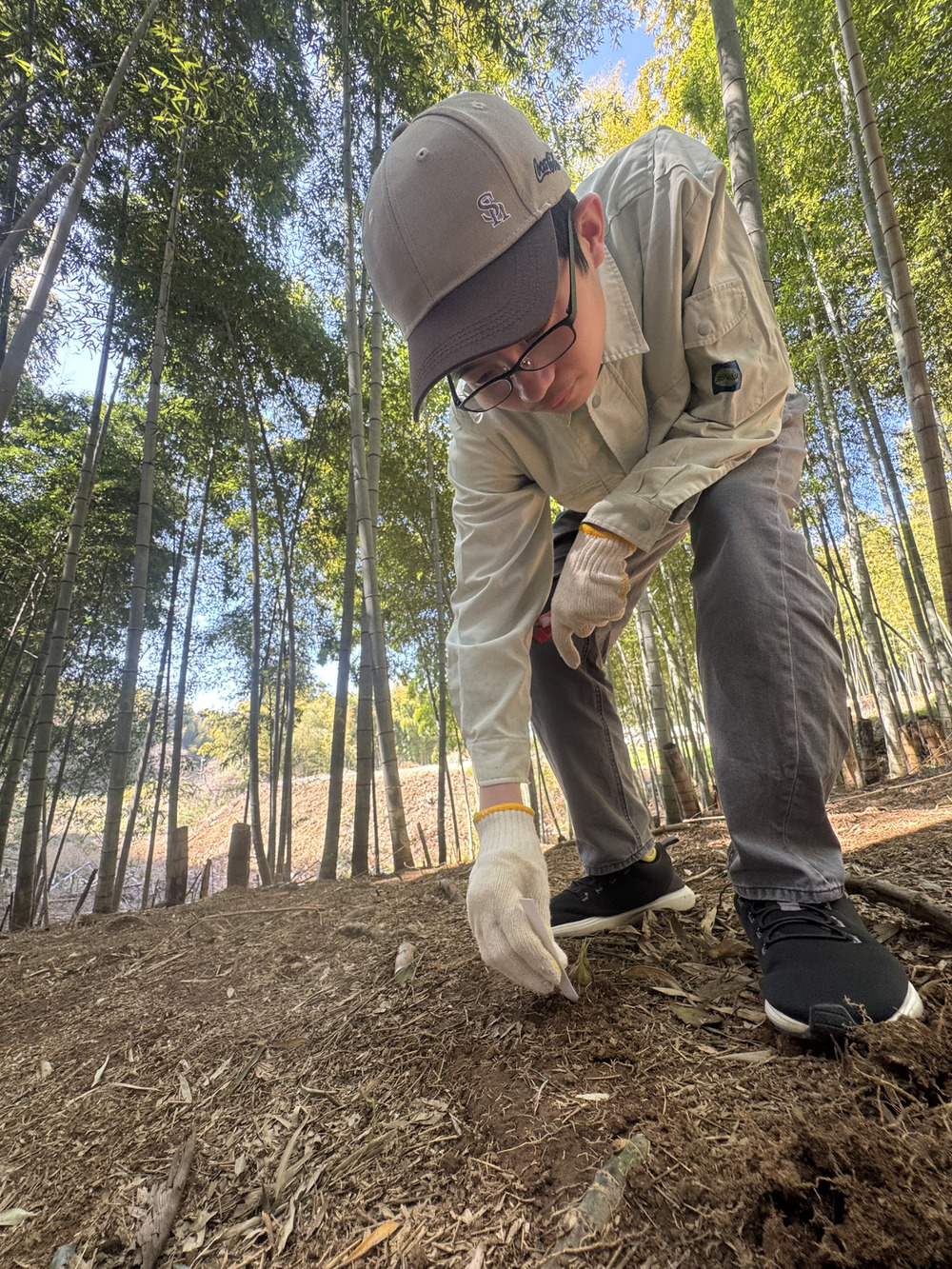 竹林に入り、一本一本タケノコを掘っています。