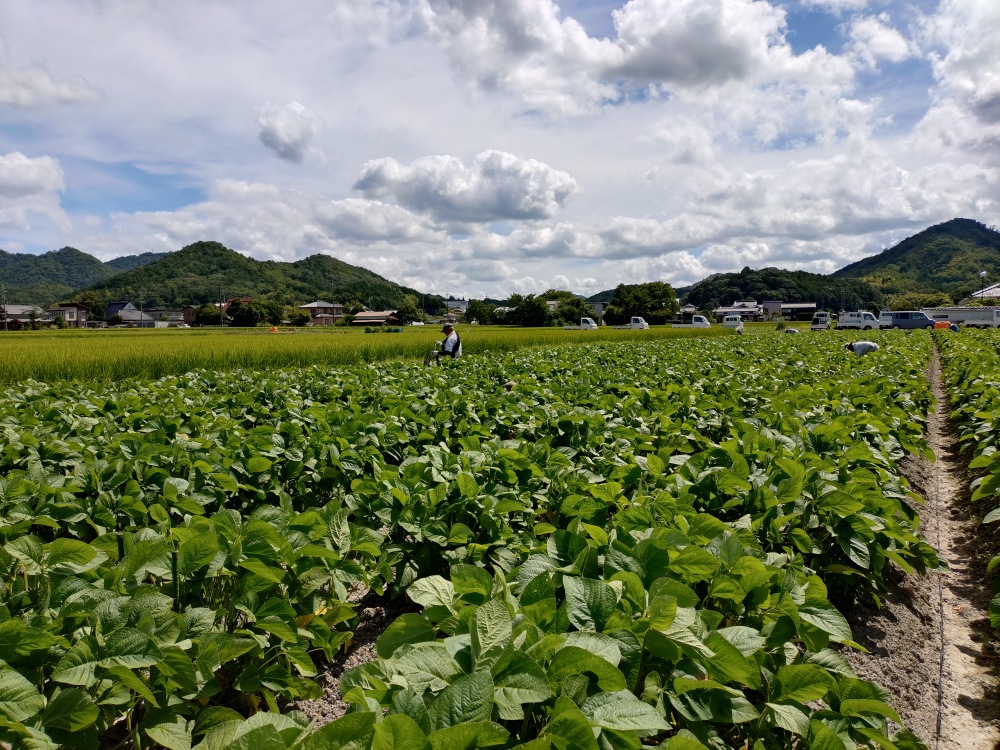 ANAグループのみなさんとともに、6月15日に苗の定植を行い、栽培管理を進めています。7月に入り、2回の土寄せを行って、株が大きく育ってきましたので、7月27日に倒伏予防のための支柱を立てて、マイカ線を張りました。