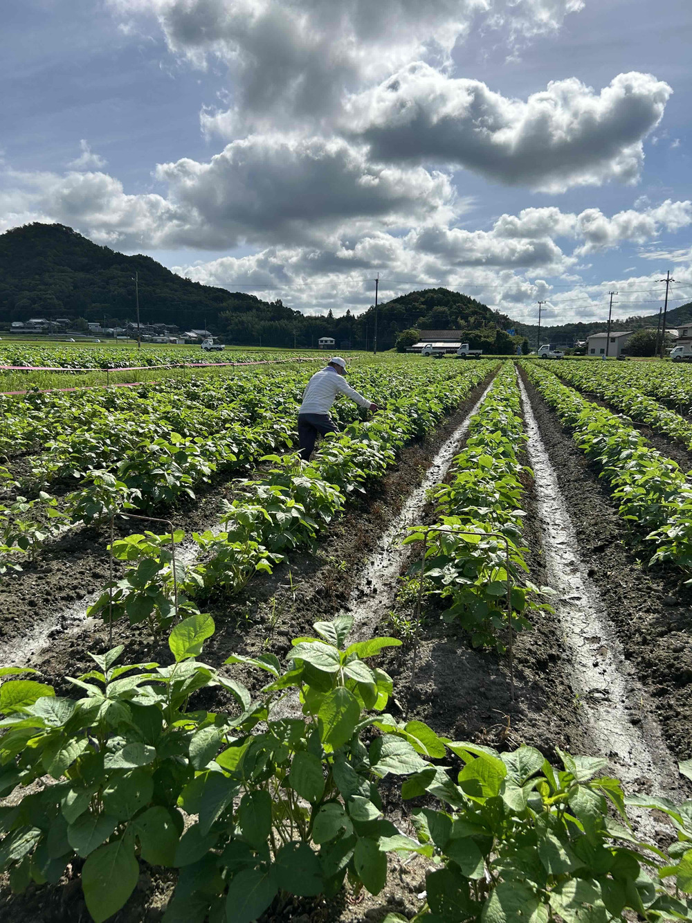 丹波篠山黒大豆枝豆は、水田を数年スパンで転作して栽培を行っていますので、水あては比較的効率的に行うことができます。高畝で栽培していますので、畝間に通水して潅水する形です。300年以上前に生み出された「犠牲田」からはじまる丹波篠山黒大豆栽培は日本農業遺産にも認定されていますが、このような潅水の仕組みも、そのような歴史のうえにあるようにも思います。