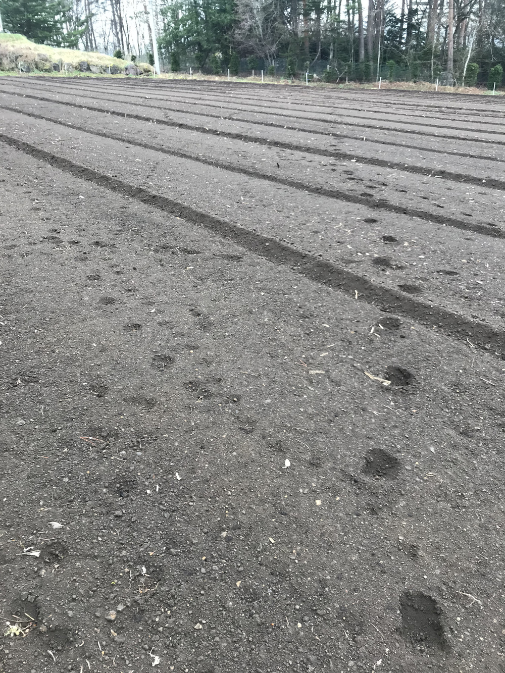 先日耕してきれいにしたとうもろこし畑に、大きい足跡(鹿)やかわいい足跡(キツネ?)がたくさんついていました。とうもろこしがまだハウスで育っているうちに、畑に柵を設置していきます。完成すると、人間が檻に入って作業をしているような光景になりそうですが、、動物と共存しながら私たちの農作物を守るには、今のところはこの方法でやっています。