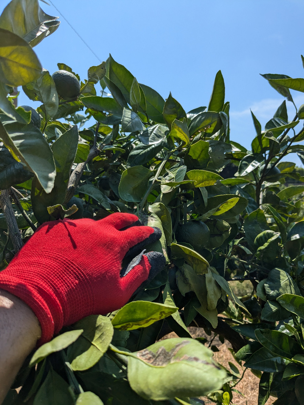 私は捻枝(枝を捻る)をして果実を下向きにします。